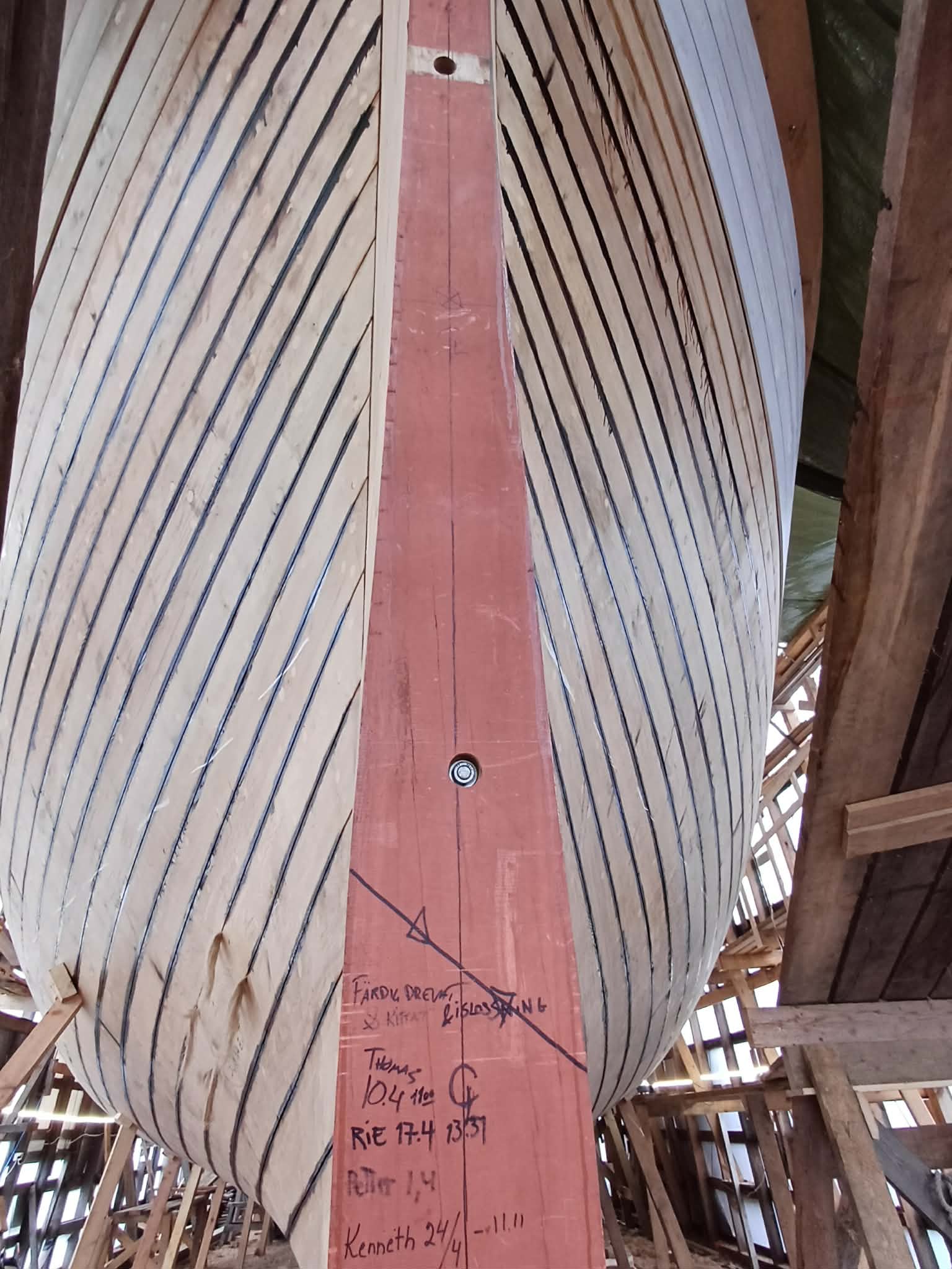 Sjösättningen är en milstolpe under byggprocessen. Mycket arbete och kostnader återstår ändå innan vi ser henne på havet under segel. Då blir det fest igen!